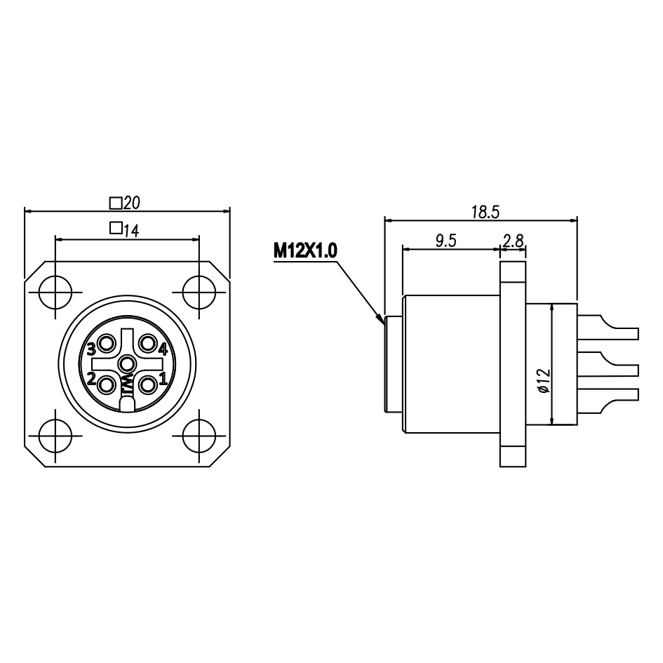 M12 Female Panel Mount, Solder Type, Square Flange Type