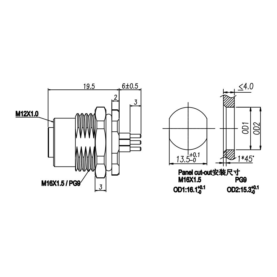M12 母头面板式,PCB型,前锁安装